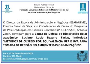 A Escola de Administração e Negócios da Universidade Federal de Mato Grosso do Sul (ESAN/UFMS) convida a comunidade acadêmica e o público interessado para prestigiar a defesa de dissertação de Luciano Lucio Bezerra, mestrando(a) do Programa de Pós-Graduação em Ciências Contábeis (PPGCC).