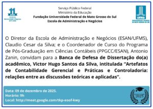 A Escola de Administração e Negócios da Universidade Federal de Mato Grosso do Sul (ESAN/UFMS) convida a comunidade acadêmica e o público interessado para prestigiar a defesa de dissertação de Victor Hugo Santos da Silva, mestrando(a) do Programa de Pós-Graduação em Ciências Contábeis (PPGCC).
